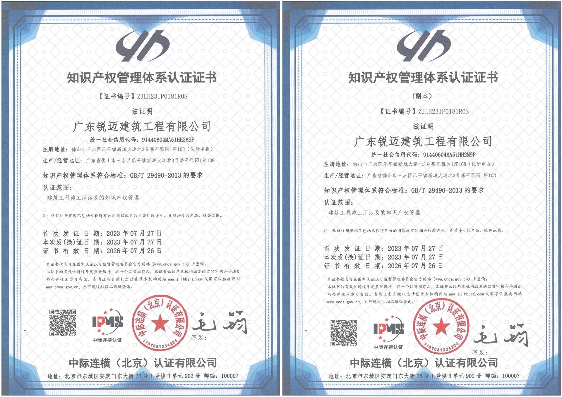 熱烈祝賀廣東銳邁建筑工程有限公司榮獲“知識(shí)產(chǎn)權(quán)管理體系認(rèn)證證書”